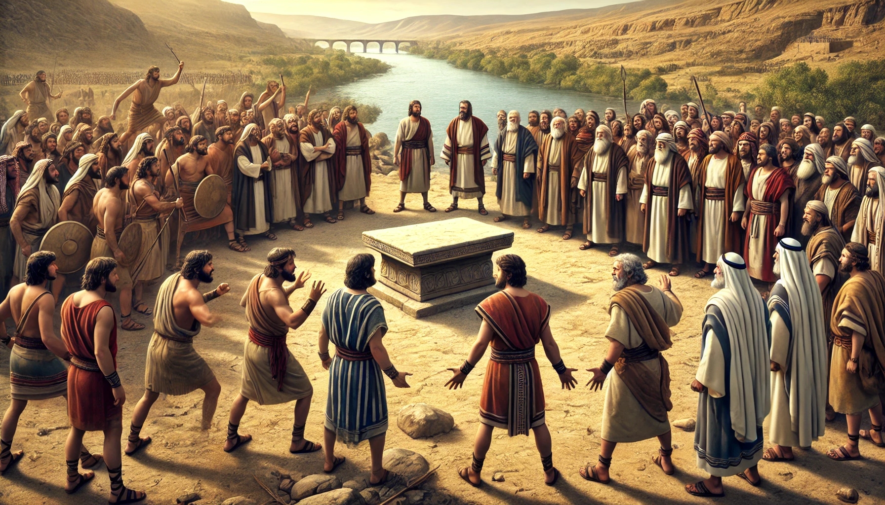 Mais sur le chemin du retour, elles dressent un grand autel au bord du Jourdain – en pleine zone frontière entre Israël de l’Ouest et de l’Est. Les tribus occidentales interprètent cela comme une rupture de l’alliance avec Yahvé, car selon Deutéronome 12,13–14, les sacrifices ne doivent être offerts qu’au lieu désigné par Dieu. Un « second autel » pourrait être compris comme l’établissement d’un culte parallèle – une division dangereuse.