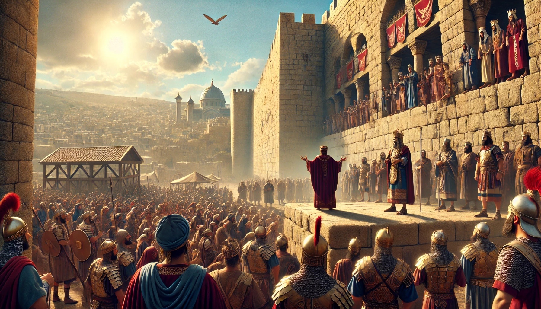 Devant Jérusalem commence alors une bataille psychologique. Le commandant assyrien se place devant les murailles et parle à haute voix au peuple. Il se moque de la confiance placée en l’Égypte et surtout de la confiance en Dieu. Ses paroles sont soigneusement choisies pour semer la peur : aucun dieu des autres nations n’a pu sauver son peuple de l’Assyrie — pourquoi serait-ce différent cette fois-ci ?