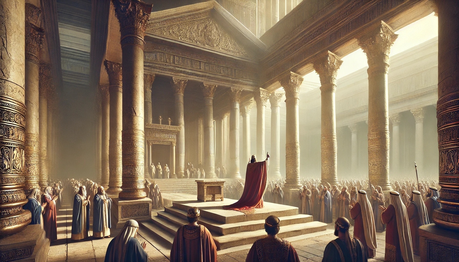 Salomon se tient devant l’autel, devant tout le peuple. Ce n’est pas un moment privé, mais une prière publique. Un roi qui s’incline devant Dieu — cela seul est déjà un signe puissant.