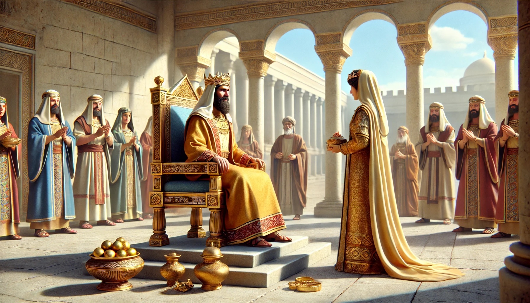 La scène commence par une visite : la reine de Saba arrive à Jérusalem. Elle a entendu parler de la sagesse de Salomon — mais elle veut le voir par elle-même. Elle apporte des questions, peut-être aussi des doutes.