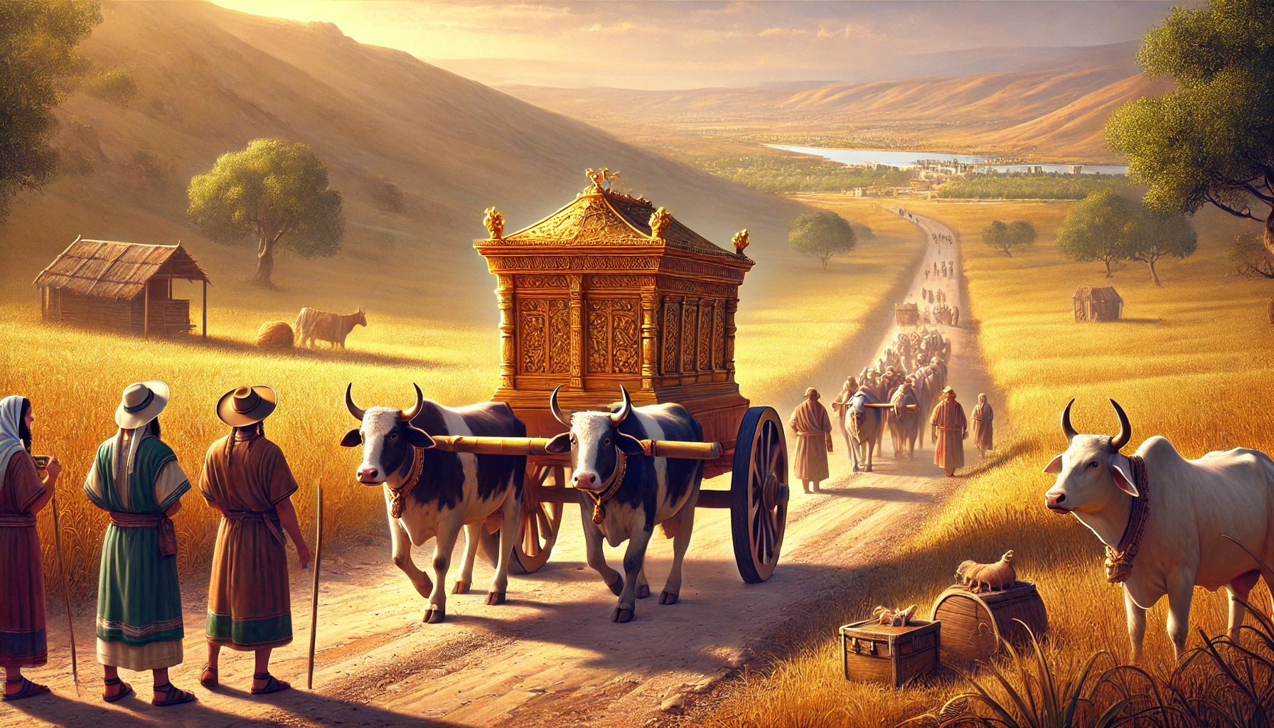 Les Philistins décident de renvoyer l’arche sur un char neuf, avec des représentations d’or des plaies, tiré par des vaches qui n’avaient jamais été attelées — un test pour voir si la main de Dieu était vraiment sur eux.