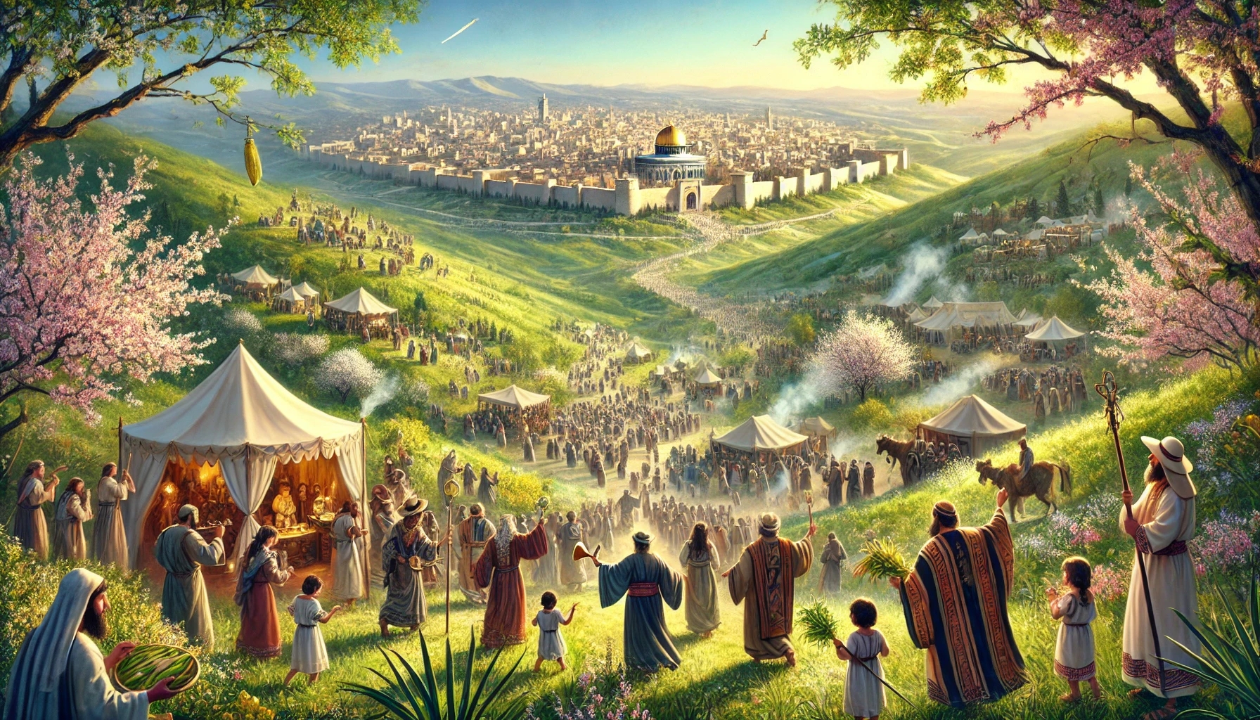 Imagine un printemps en Israël. Le froid de l’hiver est passé, les champs sont en fleurs, et des pèlerins viennent de toutes les directions vers Jérusalem – à pied, avec des animaux, en groupes, chantant. Des familles entières avec enfants et bagages, des bergers, des étudiants des écoles de prophètes, des citadins et des paysans – tous unis dans un même but : la fête de la Pâque.