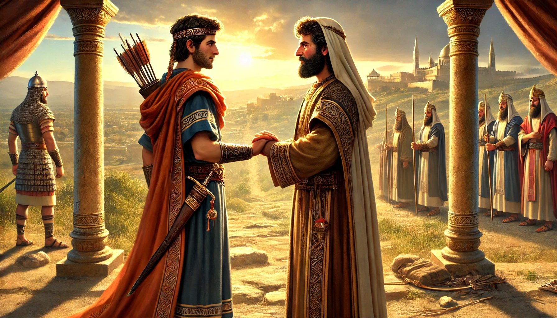 À peine David a-t-il parlé avec Saül qu’il se produit quelque chose d’extraordinaire : Jonathan reconnaît en David une âme sœur. Sans paroles, sans conditions, leurs cœurs s’attachent l’un à l’autre. Cette amitié n’est pas stratégique, mais spirituelle. Jonathan n’aime pas David malgré son élévation, mais précisément à cause d’elle. Il reconnaît la main de Dieu sur la vie de David et renonce volontairement à ses propres prétentions. En donnant à David son manteau, ses armes et sa ceinture, il lui transmet symboliquement la dignité, la protection et l’espérance royale.