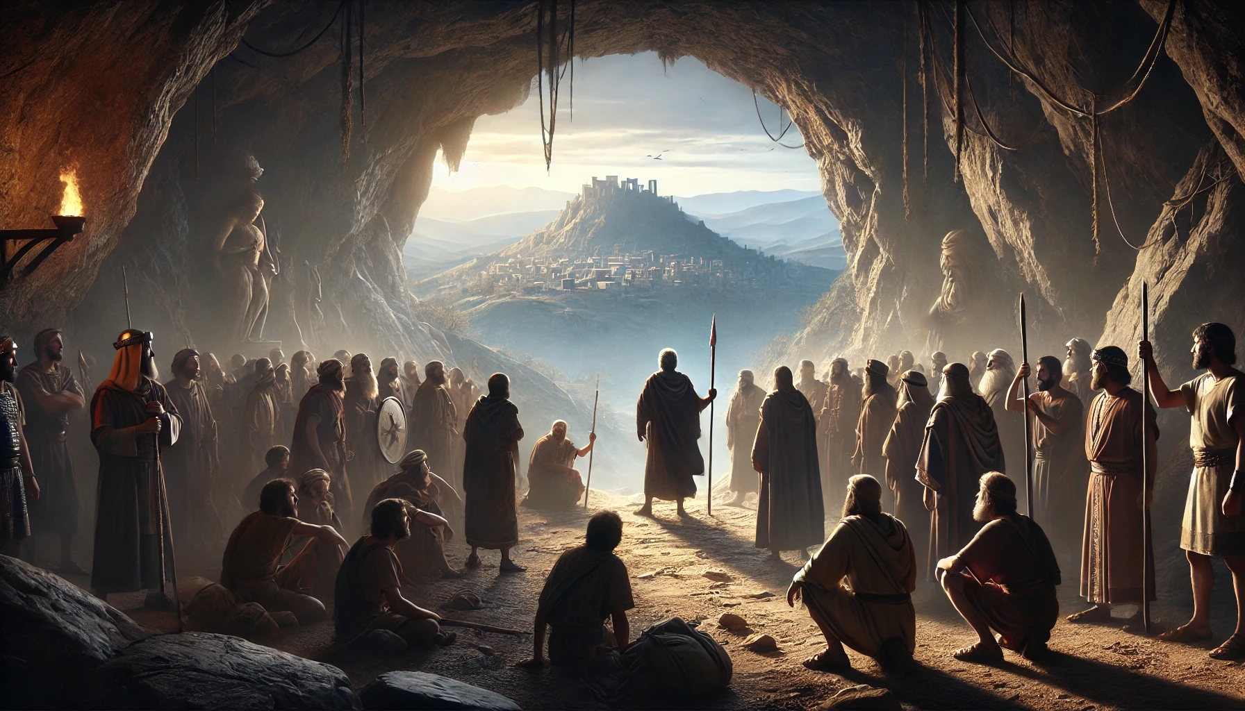 David est de nouveau en fuite. Il trouve refuge dans la caverne d’Adullam, un lieu sombre et isolé. Mais cette caverne ne devient pas un lieu d’isolement, mais de rassemblement. Les uns après les autres, des hommes viennent à lui : ses frères, sa famille — puis ceux que personne ne veut. Des hommes dans la détresse, endettés, amers, sans espoir. Ils seront quatre cents. Pas une armée de héros, mais une foule de brisés. Et David devient leur chef — non par la force, mais par sa présence.