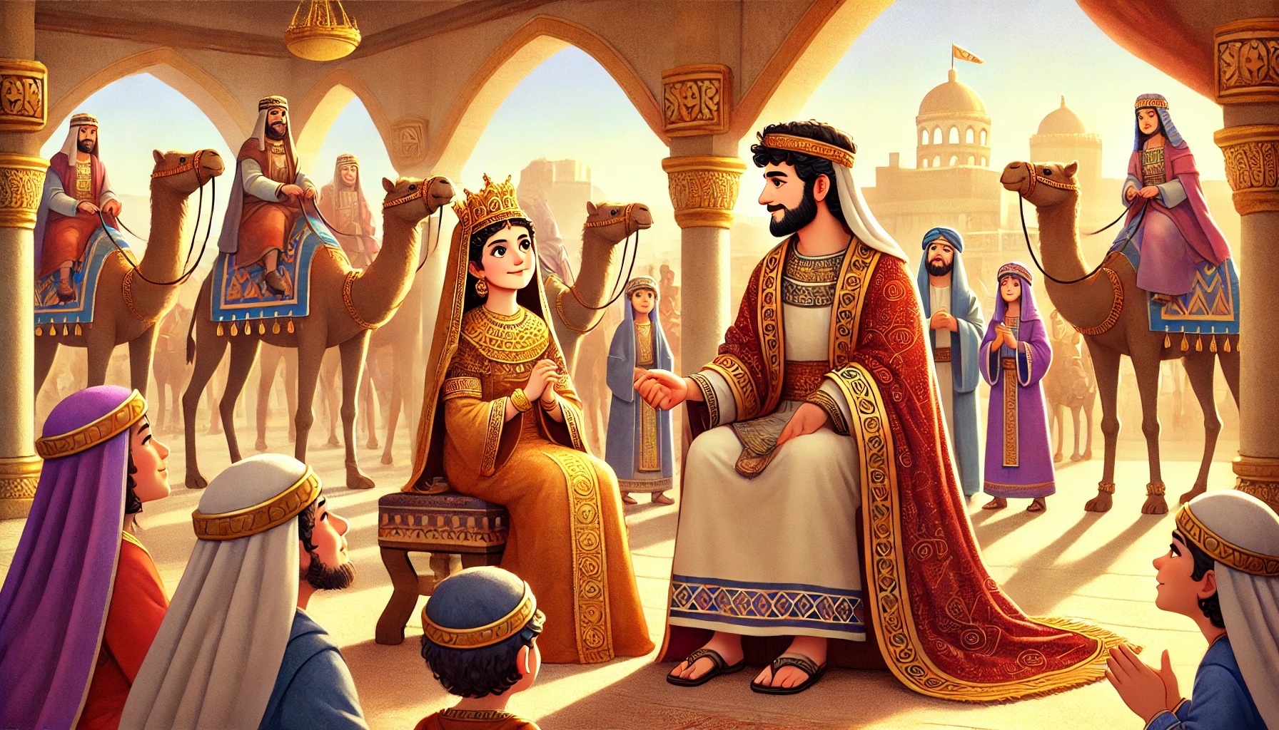 La reine de Saba voyage à Jérusalem avec une grande caravane. Des chameaux transportent des épices précieuses, de l’or et des pierres précieuses. C’est un voyage long et fatigant, mais elle a un objectif : découvrir si les histoires sur Salomon sont vraiment vraies.