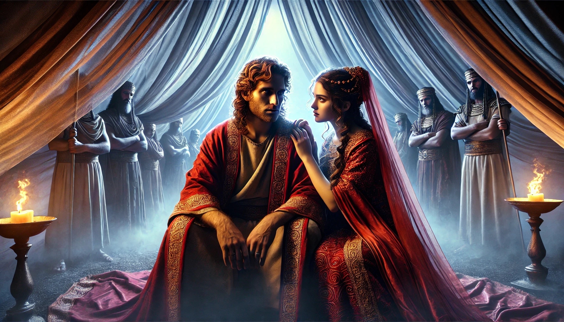 Puis Delila apparaît. Pas une combattante, pas une guerrière — seulement des mots, de la tendresse, de la séduction. Mais les mots peuvent être plus forts que les épées. Les princes philistins lui offrent de l’argent. Elle doit découvrir le secret de la force de Samson. Elle commence son œuvre — douce, insistante.